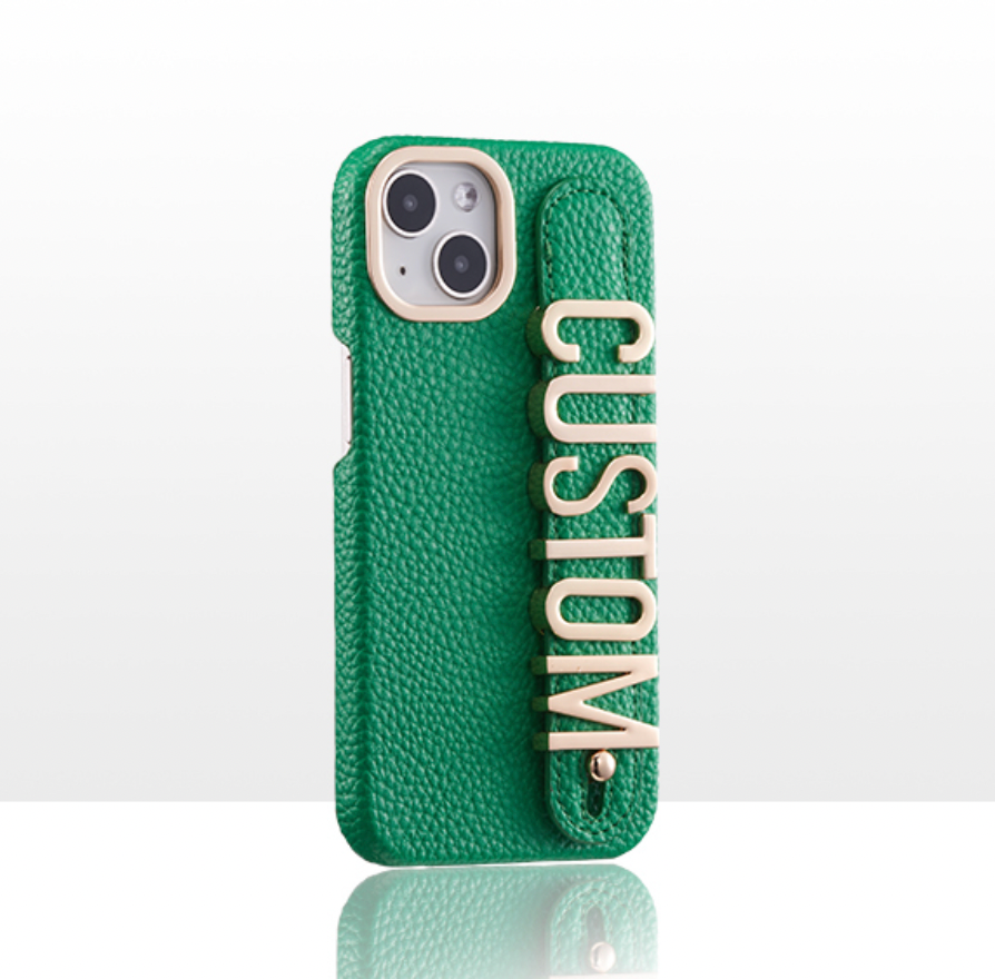 Our large lettered Bottega Green pebbled vegan leather case is crafted with your custom text on a gold metal lettered handle. The highly praised leather adds quality and character to the case and is largely responsible for the success of the collections.