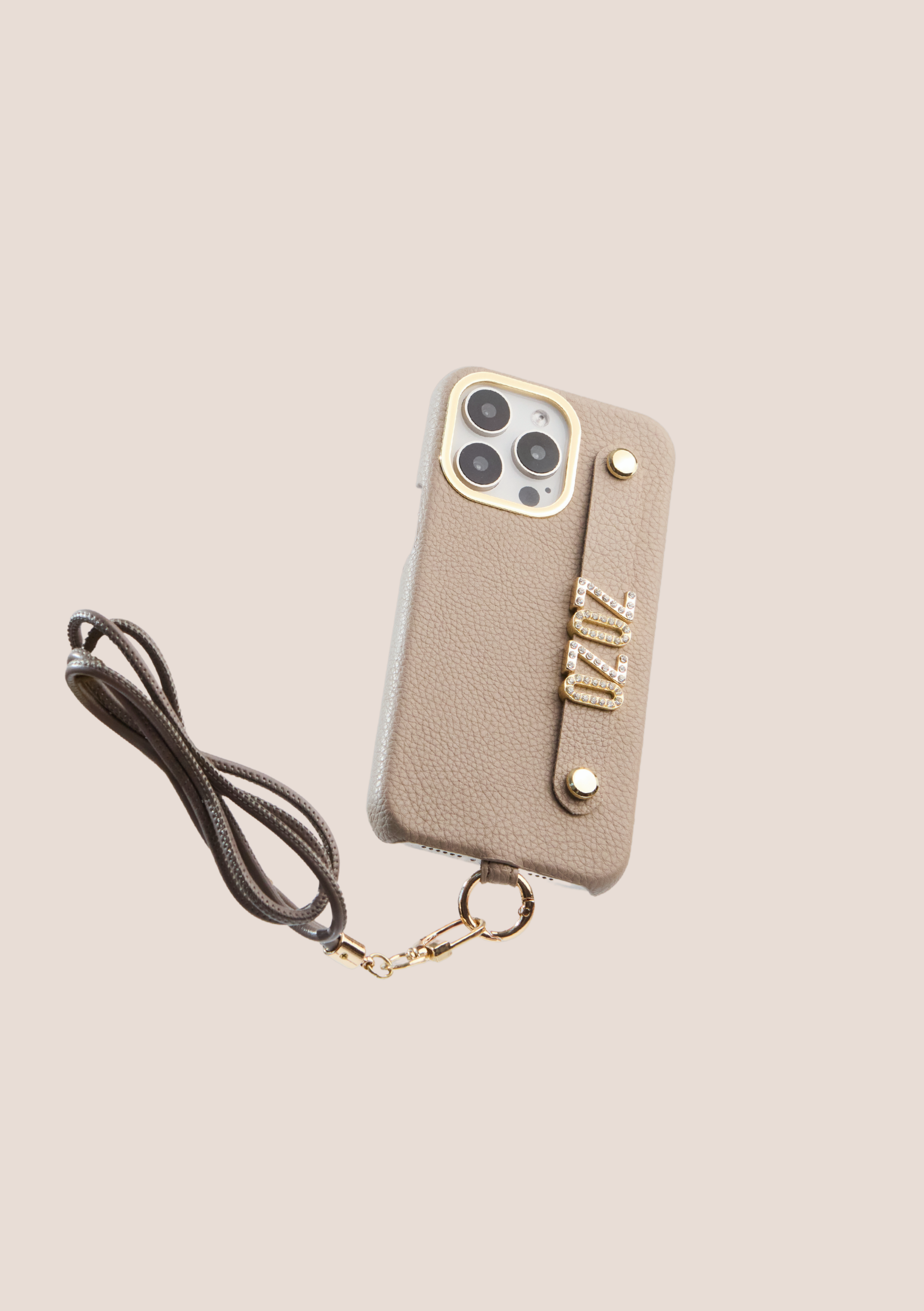 A soft faux leather case with a detachable strap — wrist or crossbody.